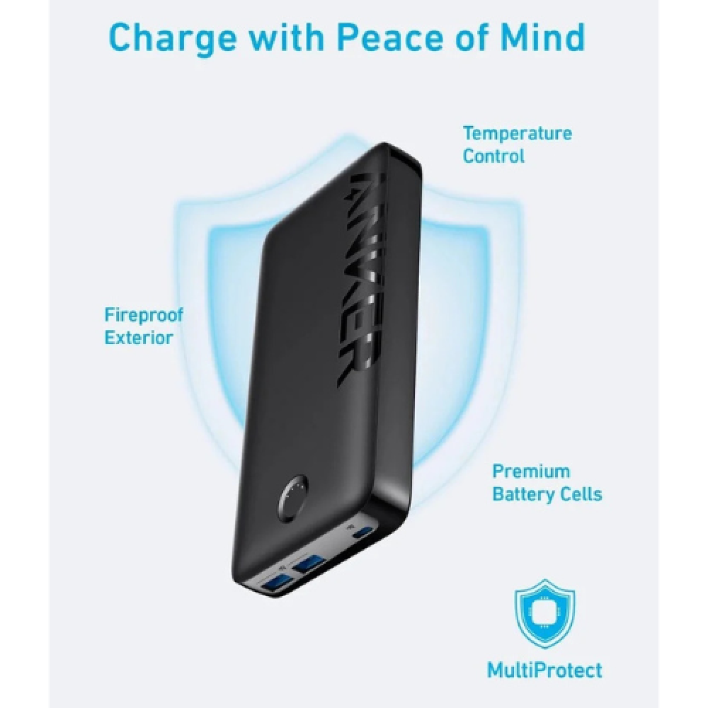 أنكر 335 باور بانك سعة 20000 مللي أمبير، يتميز بمنفذ USB-C بقدرة 20 واط PD لشحن سريع وآمن، مثالي للهواتف والأجهزة الذكية أثناء التنقل .