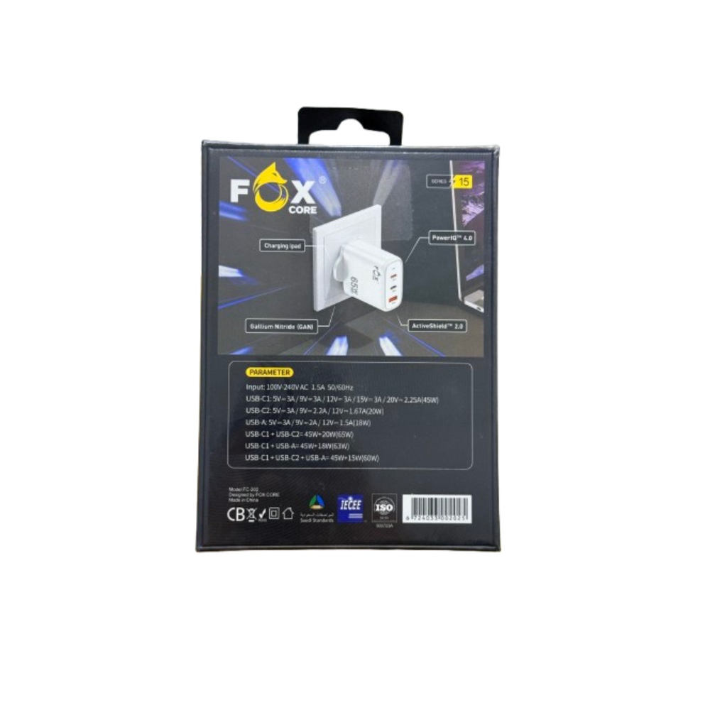 رأس شاحن FOX Core موديل FC-200 بقدرة 65W بتقنية GaN، يوفر شحن سريع عبر منفذ USB-C PD ومنفذ USB-A QC 3.0، بحماية متكاملة وتصميم صغير أنيق .