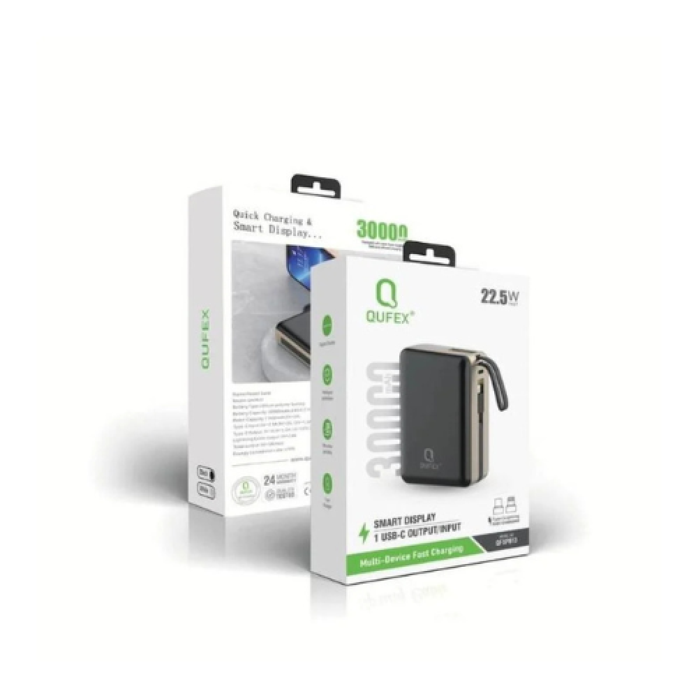 باور بانك QUFEX بسعة 30000mAh يدعم الشحن السريع 22.5W، مزود بشاشة ذكية لعرض حالة البطارية، مثالي للرحلات والاستخدام اليومي المكثف .